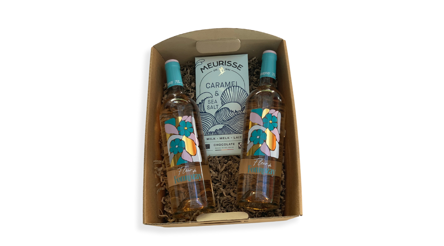 This French basket gift includes 2 Fleur de Fonrozay Rose wine from Bordeaux, and a Meurisse Caramel & Sea Salt Chocolate. It's an ideal gift.
